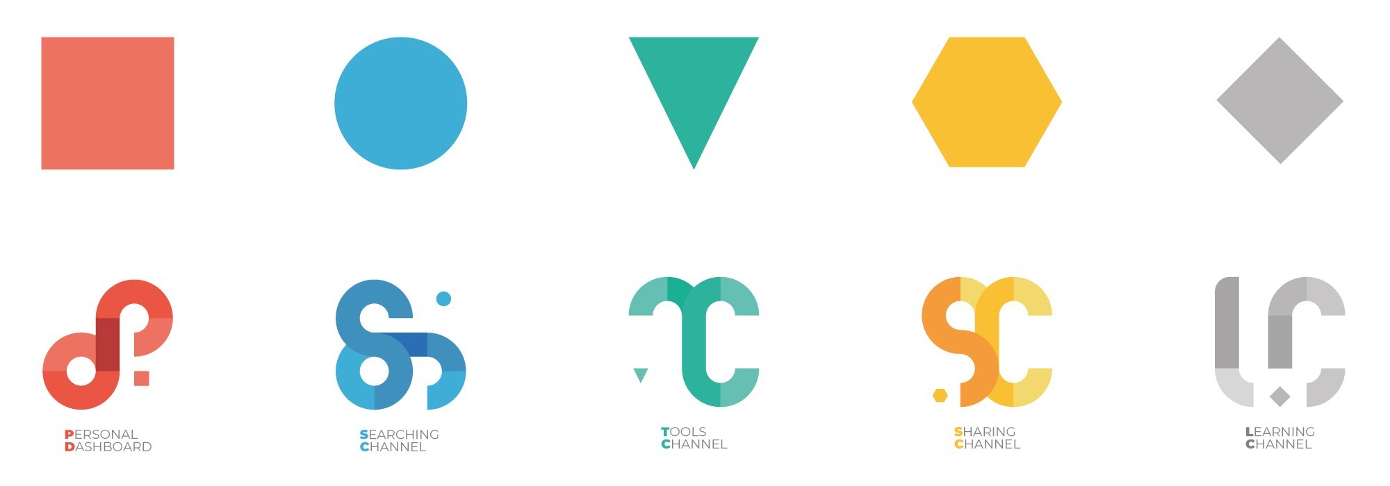 La stessa palette cromatica è impiegata anche per lo sviluppo grafico del brand dei 5 web tools della piattaforma, a cui sono associate altrettante forme elementari che danno vita a composizioni grafiche per comunicare le potenzialità degli strumenti stessi.